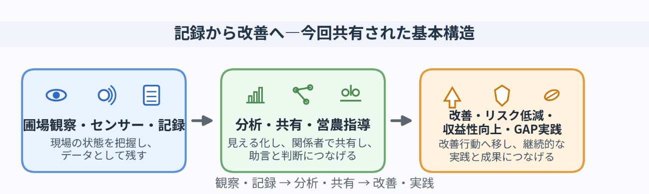 今回のシンポジウムは、スマート農業を「省力化のための技術」としてのみ捉えるのではなく、農業の持続性、収益性、信頼性、そして組織としての営農支援力をどう高めるかという広い視野のもとで再考する機会となりました。データをどう記録し、どう生かし、どう現場の改善につなげるか。その問いは、GAP(適正な農業実践)を進めるうえでも、これまで以上に重要になっているといえます。