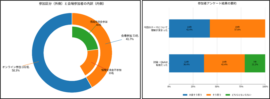 参加者アンケートの結果からも、今回のテーマ設定と内容が高く評価されたことがうかがえます。回答33件のうち、「今回のテーマについて理解が深まった」は「そう思う」19件、「大変そう思う」14件で、全回答が肯定的でした。また、「討論・Q&Aは有用だった」も「そう思う」14件、「大変そう思う」12件で、計26件が肯定的でした。「今後の開催にも参加したい」は23件が「はい」であり、継続的な開催への期待もうかがえました。内容評価でも、1日目・2日目ともに「よい」「大変よい」が各32件で、全体として満足度の高い開催となりました。
