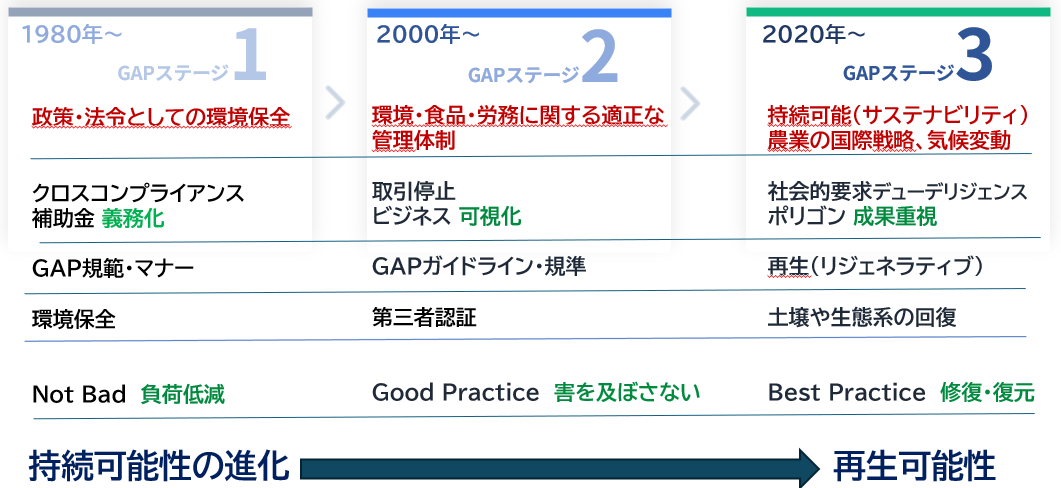 まず、私たちがアップデートすべきは「GAPの定義」そのものです。かつて欧州でスタートしたGAP(Code of Good Agricultural Practice)は、法令遵守や環境負荷低減の「ステージ1」でした。2000年代には、取引条件としての第三者認証である「ステージ2」へと進みました。そして現在、世界は「ステージ3」に突入しています。これは、単に「害を及ぼさない(Good Practice)」だけでなく、農業を行うことで土壌や生態系を「修復・復元する(Best Practice)」環境「再生型(リジェネラティブ)農業」の段階です。