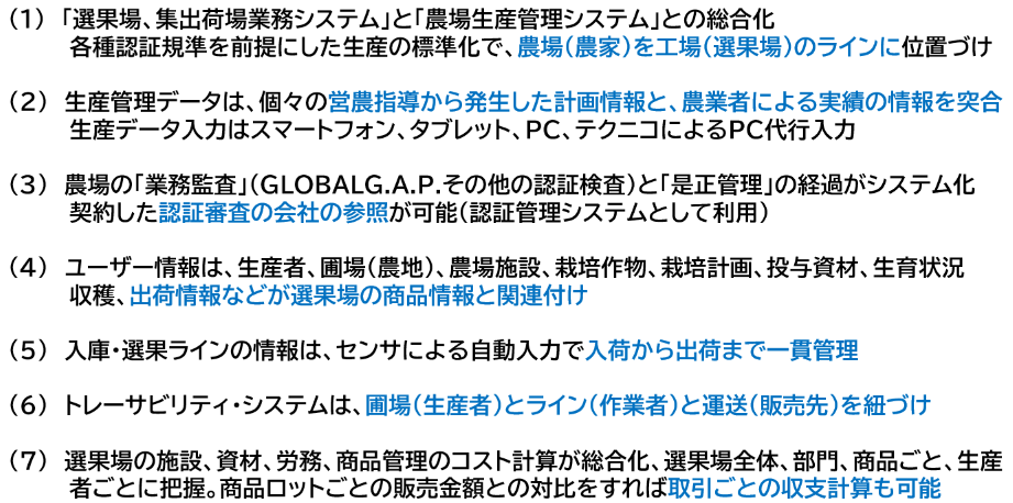 「ERPagro は、生産者・農場も組織の資源として、選果場を中心に組織全体の経営資源を統括的に管理し、経営全体の効率化を図る手法として、統合型基幹業務システムとしてパッケージで提供されている。」