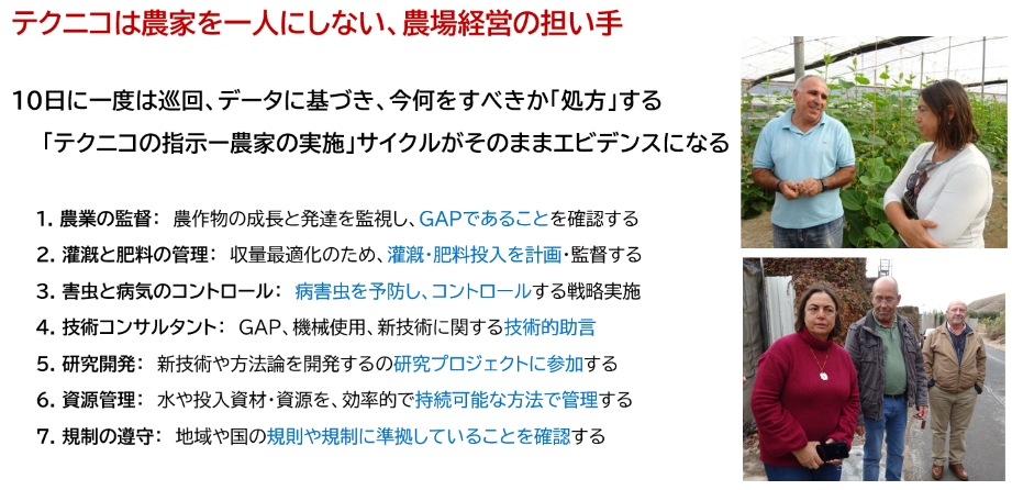 この高度なシステムを動かし、農家とデータを繋いでいるのが「テクニコ」と呼ばれる営農指導員です。彼らは単なる指導員ではなく、高度な学位を持つ「農場の主治医」でありコンサルタントです。