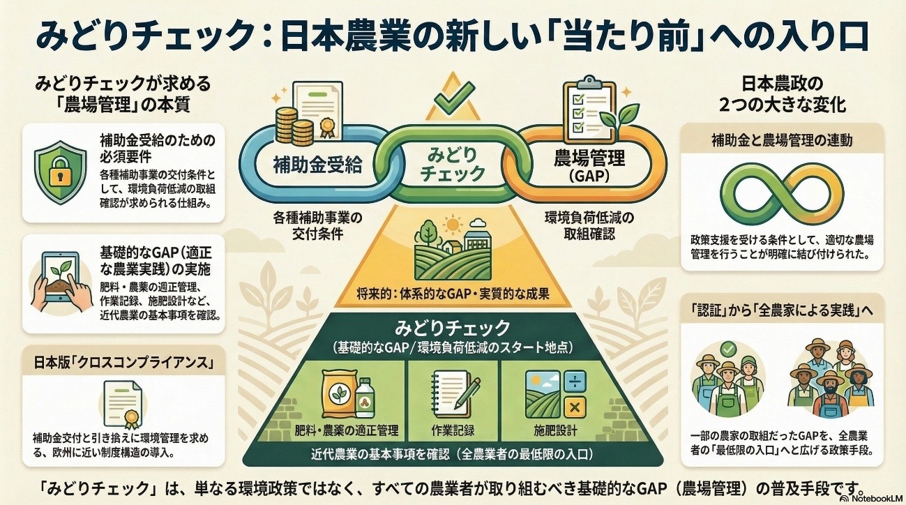 みどりチェックは、その意味で、日本の農業政策におけるGAP普及の新しい入口として位置づけることができるでしょう。