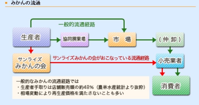 しかし、サンライズみかんの会の販売方法は、産地おける市場内仲卸的な販売形式を採り、スーパーや果物店へ、そのままディスプレイできる包装形態での受注を受けて、包装して出荷したり、また、ネット販売やカタログ販売に対応したりして、その個々の商品形態毎に生産者に清算金を支払っている。そのため、出荷のタイミングと品質が伴えば、有利に取り扱ってもらえるということで、生産者は喜んでいる。