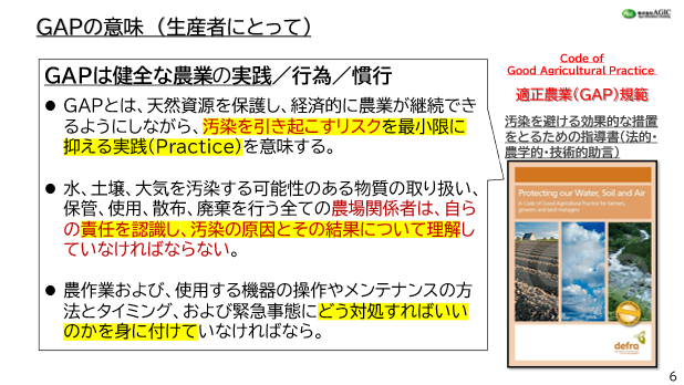 ヨーロッパで一致したGAPの考え方についてですが、特にこの右側にある本は、コード・オブ・グッドアグリカルチュラル・プラクティス(GAP規範)です。日本語に訳すと適正農業規範ということになるわけですね。汚染のリスクを最小限にして効果的な措置を取っていくための法的説明、あるいは農学的、あるいはそれらの技術を具体的に説明した規範です。