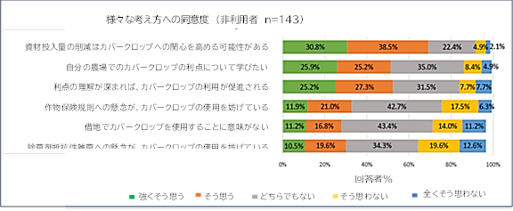 最も同意が得られた意見は「資材投入量の削減は、カバークロップへの関心を高める可能性がある」という考え方で、次いで2位、3位がほぼ同じで、「自分の農場でのカバークロップの利点について学びたい」「利点の理解が深まればカバークロップの利用が促進される」であった。これらの項目では、情報に対する飢餓感が確認され、カバークロップが自分の農場にどのような利益をもたらすかについて、もっと知りたいという思いが強く、明らかに、多くの非利用者が熱心に情報を求めていることがわかります。