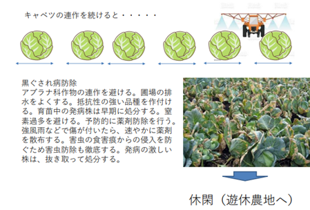 しかし、長期で良く見ていくと、連作を続けることで、最初よりも後の方が農薬の散布回数が増えるということがあります。結局、土壌病害が出やすくなってくるということで、ある若手(40代)農家さんは、キャベツ栽培を30ヘクタールぐらいやっておられるのですが、その大きい圃場でずっと連作して連作障害になってしまっては、せっかく植えつけても収穫できないとなれば経営的に大打撃ですよね。