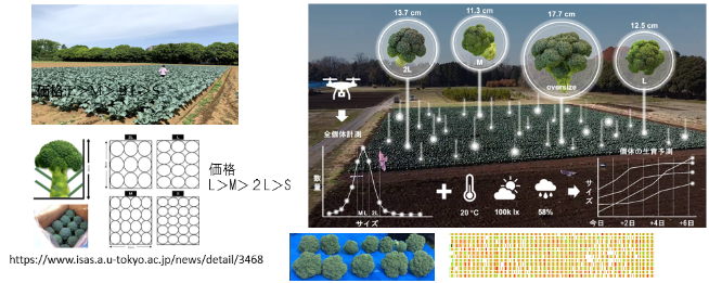 これまで困難だった「作物の状態把握」も、画像解析技術の進歩で一変しました。例えば、ドローンでブロッコリー畑を一度撮影すれば、葉に隠れた花蕾のサイズを推定し、2週間先までの生育をモデル化できます。